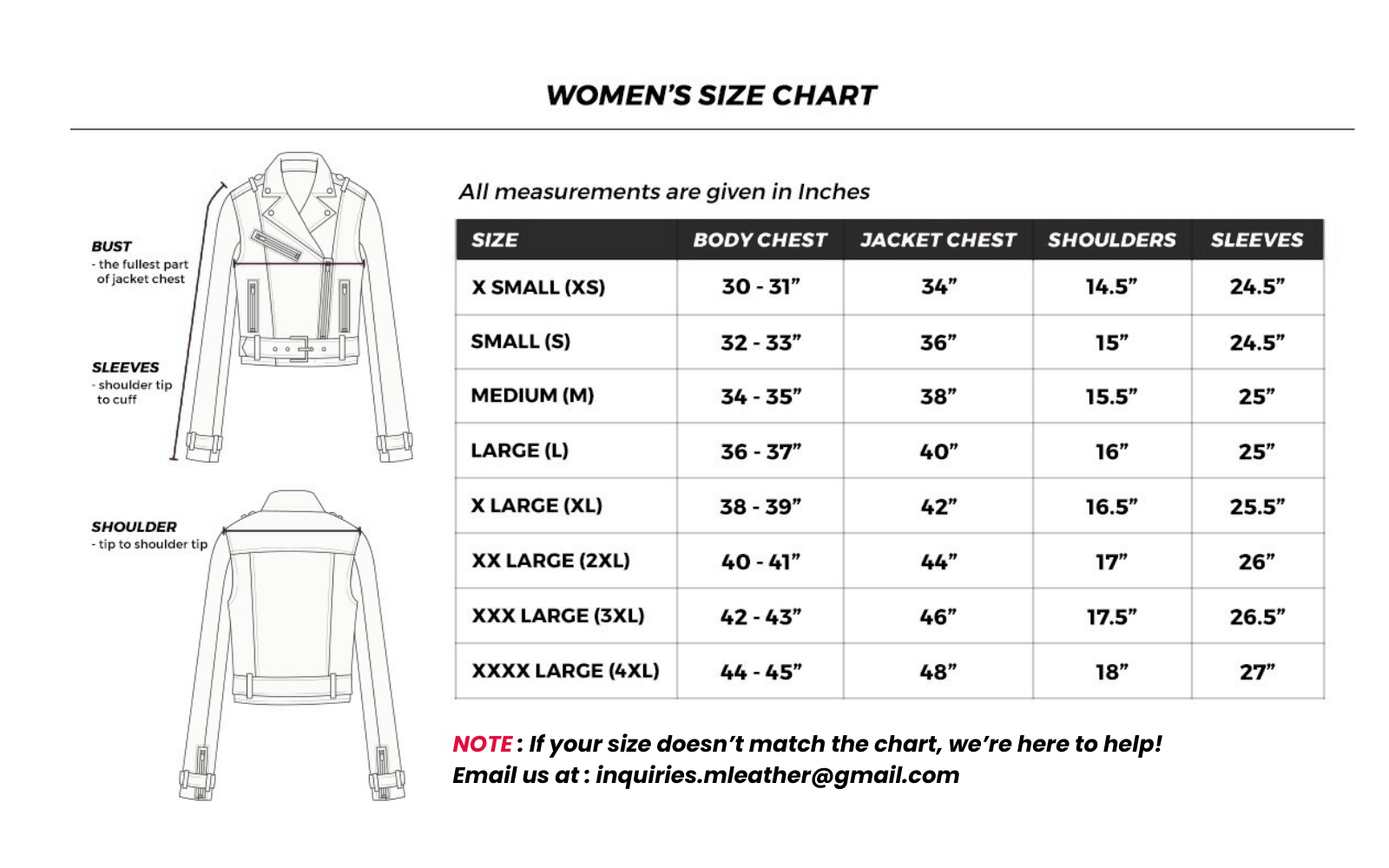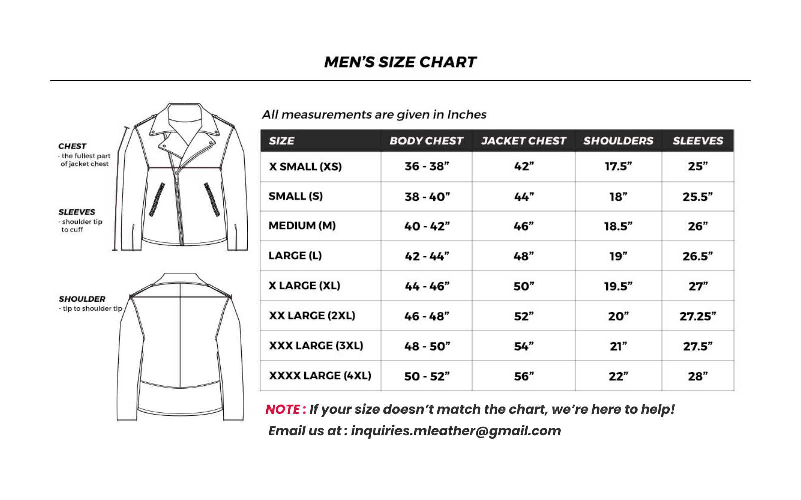 Finding the right jacket online can be tricky — we totally get that. At M Leather Jacket, every piece is crafted with both fit and movement in mind. We carefully measure each jacket before it’s listed, to make sure it closely matches the size chart below.