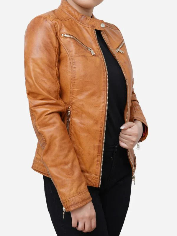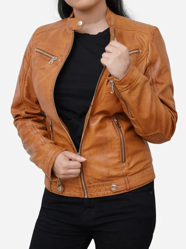 Women Maria Cafe Racer Brown Distressed Motorcycle Leather Jacket